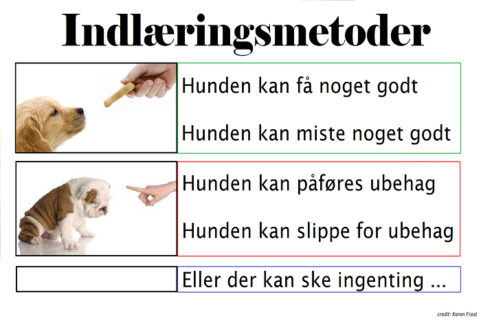 Billedet ovenfor viser de fem forskellige konsekvenser, som følger adfærd (her vist med hund). I din hverdag med hunden er det vigtigt at lægge fokus på den grønne boks, hvor ønsket adfærd belønnes og der guides ved uønsket adfærd. Står du og træner din hund vil der helt lavpraktisk ske det, at din hund får en godbid når den gøre noget du kan lide at se. Sker det at den laver fejl, så får den ikke sin godbid (den mister noget godt). For at undgå frustration efter en fejl er det vigtigt at guide hunden til en succes, så den kan opnå sin belønning igen. Ved at anvende metoder i den grønne boks arbejder du i belønningscenteret af hjernen, som er forbundet med rare følelser. Da motiverer du din hund til yderligere at samarbejde, fordi du er rar at være sammen med, hvilket styrker tilliden mellem jer.